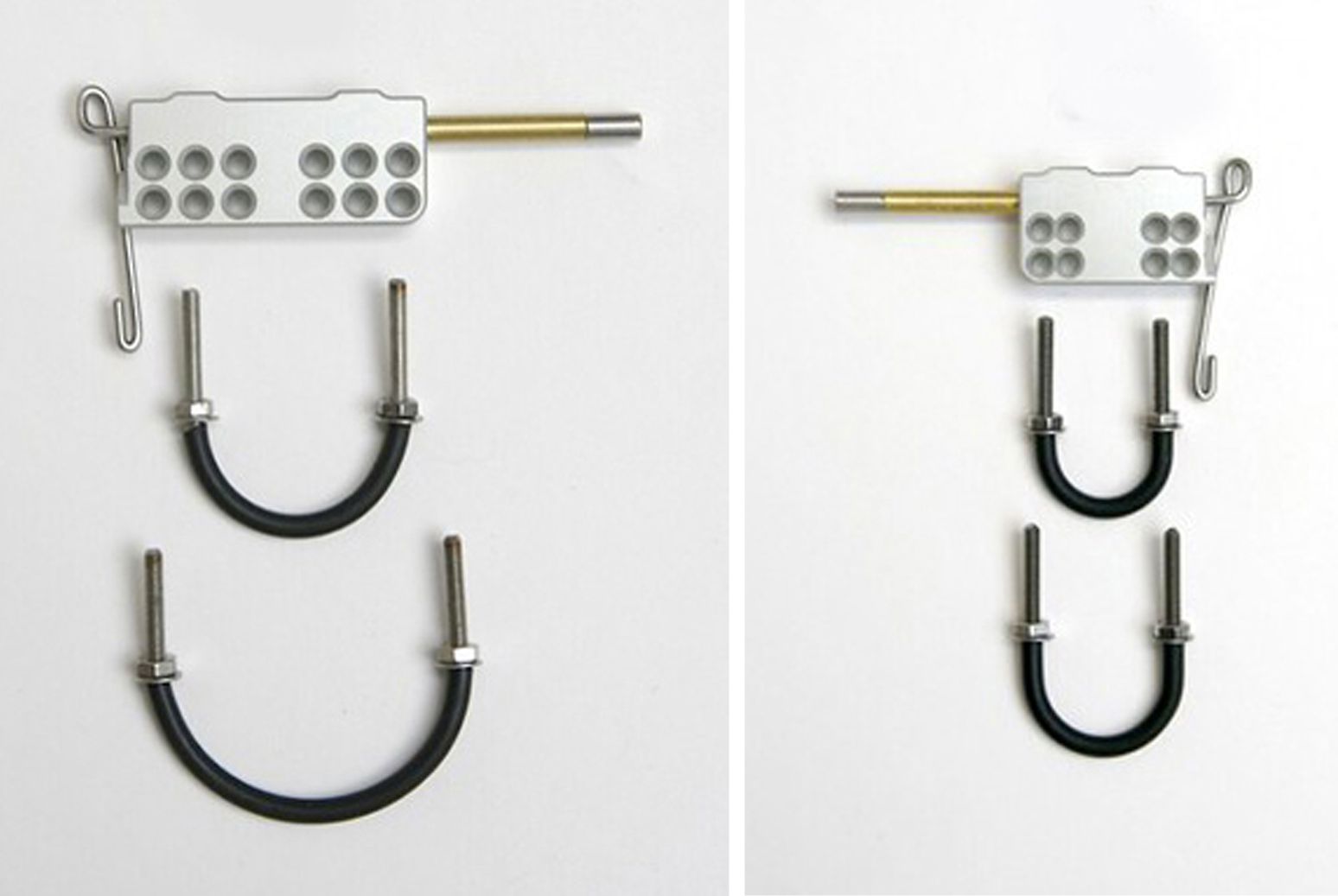 メーカーから出ているアダプターは大きく言ってUボルトで止めるものとブレーキボスに止めるものの二種類です。更にUボルト止めのアダプターには大きさ違いが二種類あります。両者はさらに左用・右用があります。とはいえ、本体をアダプターの前に止めるのか後ろに止めるのかで左用・右用が決まってきますので進行方向左に付けるから左用とは一概に言えません。