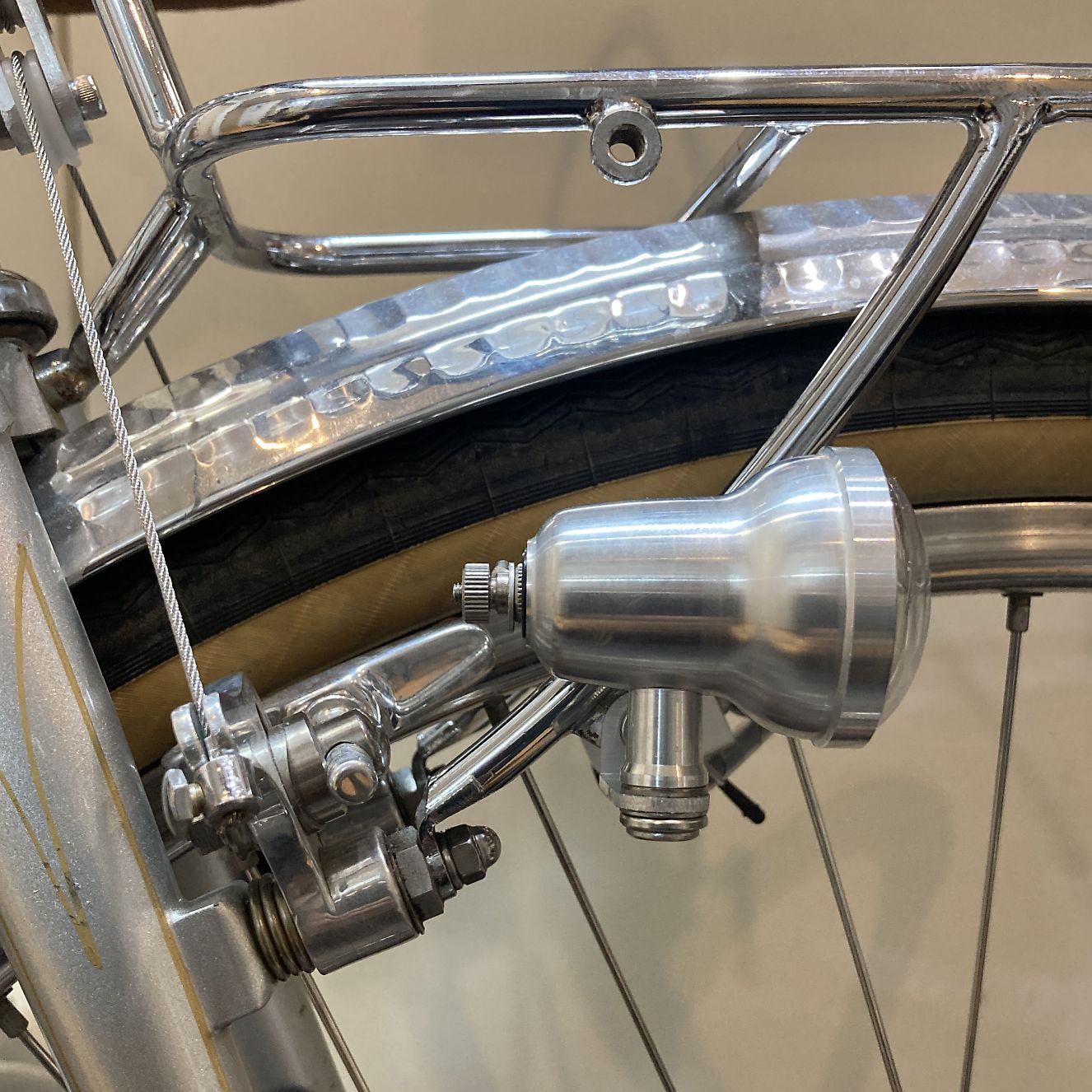 ライトは今回キムラ製のものにして、ダイナモと分離させました。本来はガード先端に取り付けるものですが、右キャリアステーのダボにこれもアングルをかまして取り付けました。個人的にはガード先端に付けるものよりしっくり来ていると自画自賛しています。